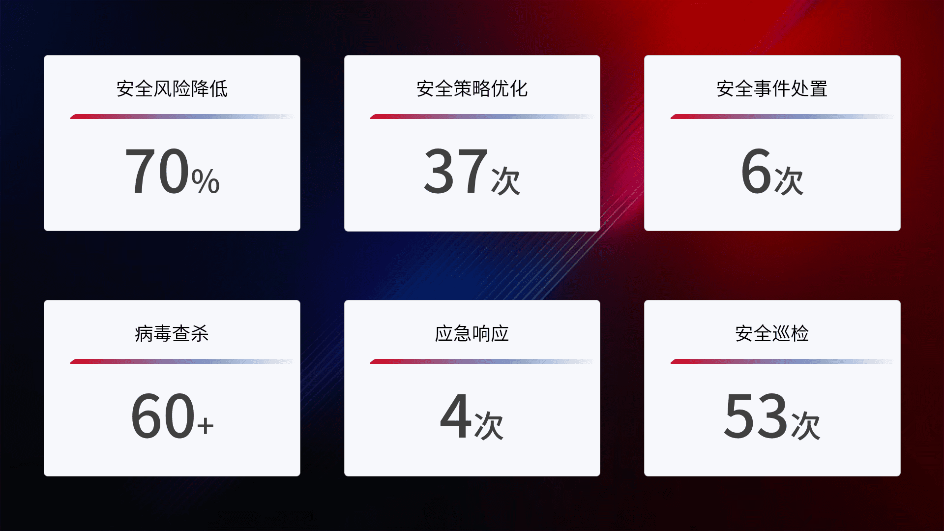 提供全面的安全事件报告体系,,,包括处置报告、、周报、、、季度和年度总结,,,,结合持续监控,,帮助客户深入了解网络安全状况。。